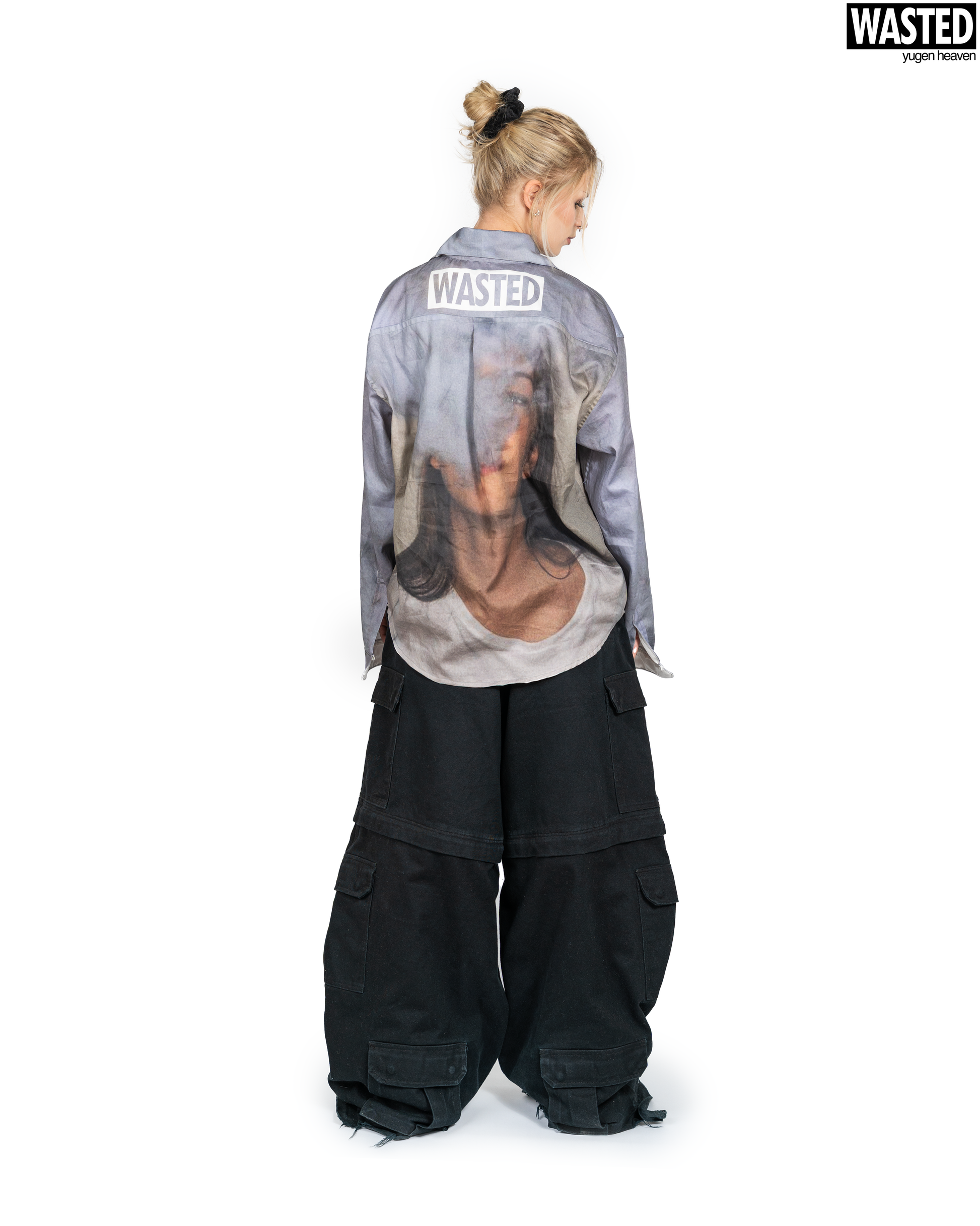 This oversize button-down features a "WASTED" face on the front and back. It features the "WASTED" logo on the back and the logo on the front, and a white interior.