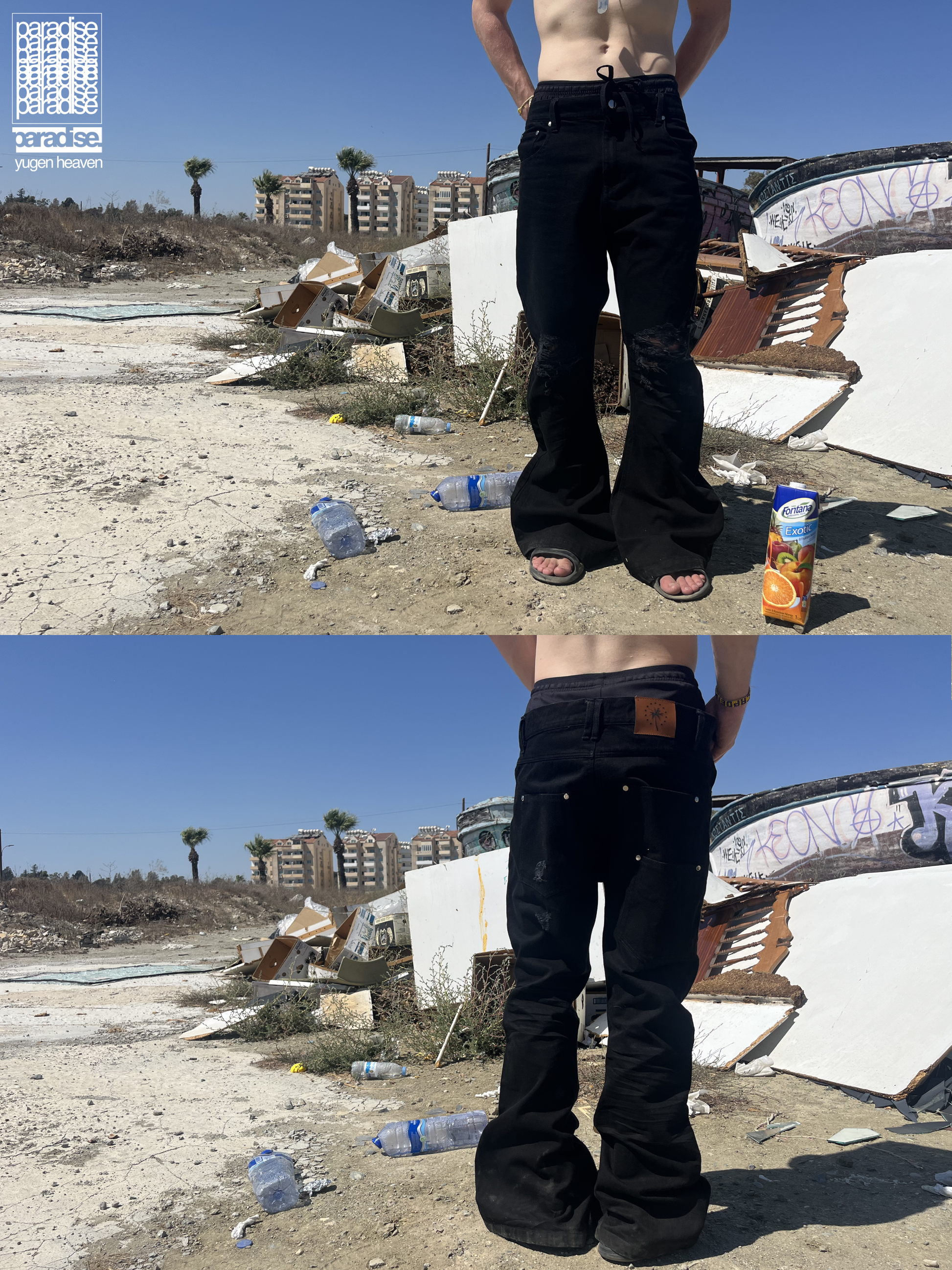 Black jeans in 13oz premium denim, detailed with distressed knees, custom hardware, metal embellishments, triple back pockets, and a flawless flared silhouette.